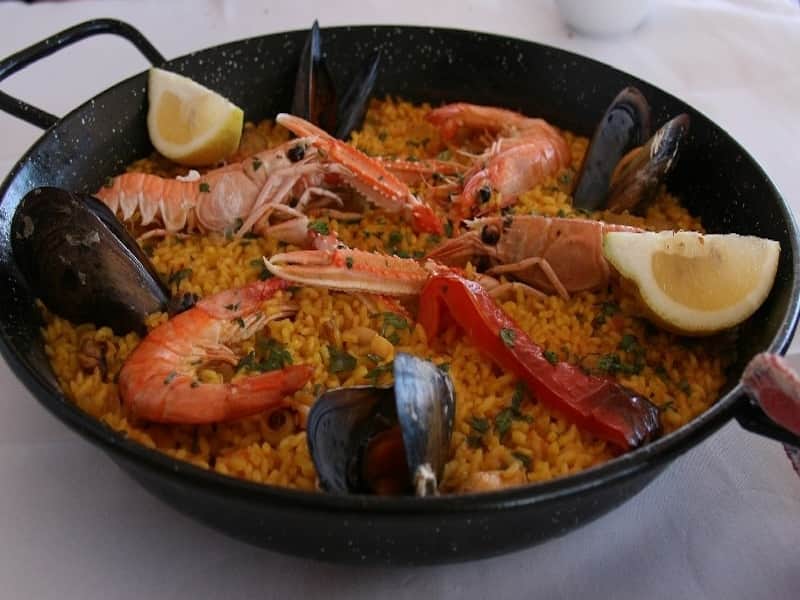 Paella is a typical dish from Valencia, rich in protein and carbohydrates. It contains chicken, rabbit, snow peas and sometimes, as in the photo, snails. On the right, we see a paella that, although not strictly traditional due to its abundant use of shellfish and crustaceans, is a dish particularly appreciated by tourists who frequent restaurants in the Valencian Community.